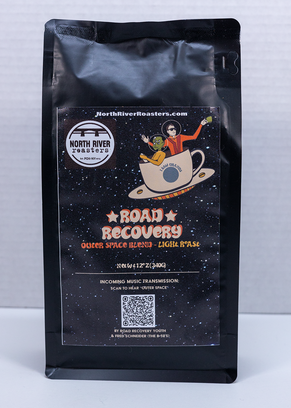 Outer Space Blend coffee was named after a song that Fred Schneider wrote, recorded, and performed with Road Recovery’s at-risk youth and Creative Staff Mentors. The coffee blend is available in light, medium and dark roast, and produced sustainably and organically, including fair-trade farming practices from North River Roasters coffee roastery in Hudson Valley, New York.Â